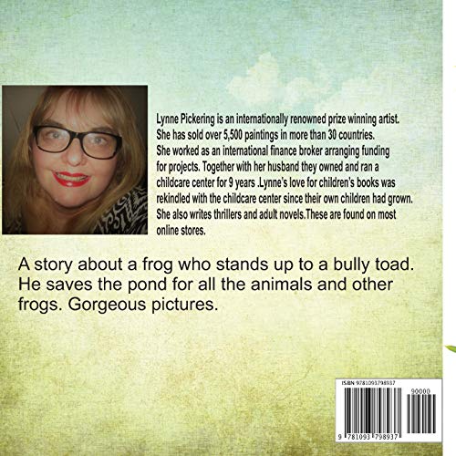 The brave little green frog saves the pond from the big bad bully toad. All the other frogs and animals team together to chase the nasty toad away. The little green frog meets a lot of his neighbors who live nearby the pond. A heartwarming story of cooperation and kindness Gorgeous pictures.