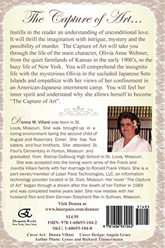 The Capture of Art Instills in the reader an understanding of unconditional love. It will thrill the imagination with intrigue, mystery and the possibility of murder. The story will take you through the life of the main character, Olivia Anne Webster, from the quiet farmlands of Kansas in the early 1900's, to the busy life of New York. You will comprehend the incognito life with the mysterious Olivia in the secluded Japanese Seto Islands and empathize with her views of her confinement in an AmericanJapanese internment camp. You will feel her inner spirit and understand why she allows herself to become "The Capture of Art".