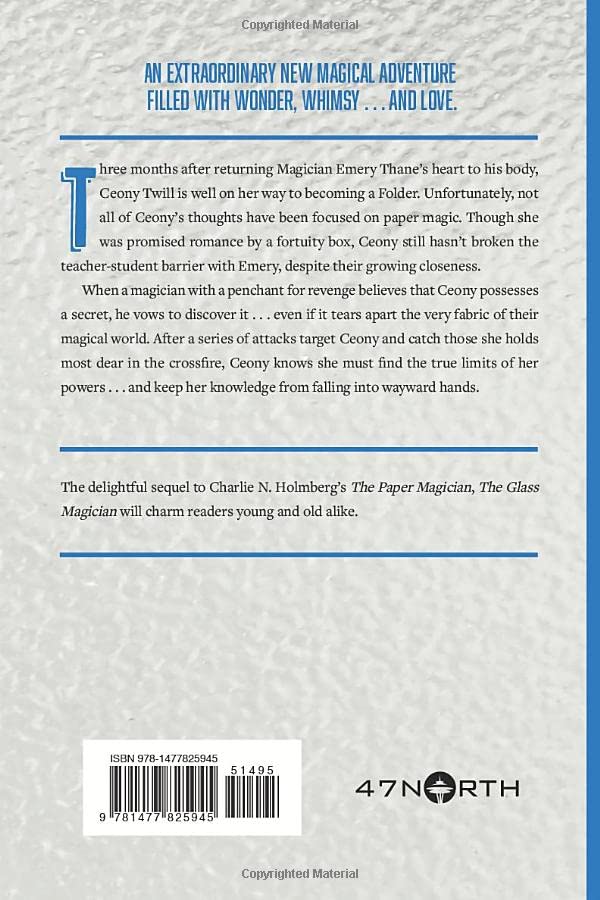 Three months after returning Magician Emery Thanes heart to his body, Ceony Twill is well on her way to becoming a Folder. Unfortunately, not all of Ceonys thoughts have been focused on paper magic. Though she was promised romance by a fortuity box, Ceony still hasnt broken the teacherstudent barrier with Emery, despite their growing closeness.When a magician with a penchant for revenge believes that Ceony possesses a secret, he vows to discover iteven if it tears apart the very fabric of their magical world. After a series of attacks target Ceony and catch those she holds most dear in the crossfire, Ceony knows she must find the true limits of her powersand keep her knowledge from falling into wayward hands.The delightful sequel to Charlie N. Holmbergs The Paper Magician, The Glass Magician will charm readers young and old alike.