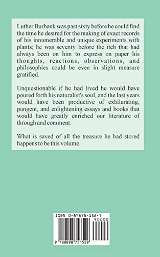 Luther Burbank was past sixty before he could find the time he desired for the making of exact records of his innumerable and unique experiments with plants; he was seventy before the itch that had always been on him to express on paper his thoughts, reactions, observations, and philosophies could be even in slight measure gratified.Unquestionably if he had lived he would have poured forth his naturalist's soul, and the last years would have been productive of exhilarating, pungent, and enlightening essays and books that would have greatly enriched our literature of through and comment.What is saved of all the treasure he had stored happens to be this volume.