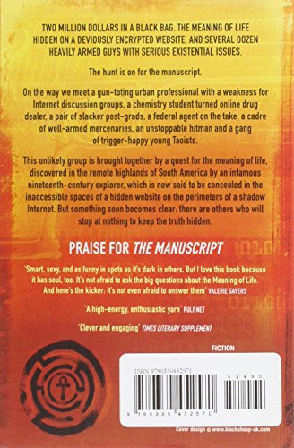 Two million dollars in a black bag.The meaning of life hidden on a deviously encrypted web site.And several dozen heavily armed guys with serious existential issues. The hunt is on for THE MANUSCRIPT.The Manuscript is a philosophical cyberthriller a novel of huge ideas disguised as a blowyourhairback thrill ride. Its cast of unforgettable characters includes a guntoting urban professional with a tragic weakness for Internet discussion groups; a former chemistry student and hacker turned wildly successful online narcotics dealer; a pair of slacker postgrads with big questions and rapidly escalating problems; a demonstrably unstoppable hitman; a dodgy federal agent with his hands in the cookie jar up to both elbows; a nameless cadre of menacing and wellarmed mercenaries (possibly in the employ of one of the world's major religions); and an entire gang of Angry Young Taoists, serenely blasting hell out of all and sundry.What could bring a group like this together? Nothing less than the meaning of life discovered in the remote highlands of South America by an infamous 19thcentury explorer, and now said to be hidden in the vast outofbounds spaces at the far edge of a shadow Internet. This is the Manuscript.Caught up in a perilous race to recover and control it are a group of young people so beset by existential unease that they are willing to risk death to know the truth; and others, backed by powerful interests, who have little compunction about killing to keep it hidden. Get ready for an ungentle ride where a number of people will get enlightened, a few will get rich, and all too many will get dead. Along the way, be prepared for some uncommon commentary on the eternal verities, computer security, rules for gunfights, postmillennial information soot, and the possibility of human connection for a generation that believes in nothing save what they read on the Net.
