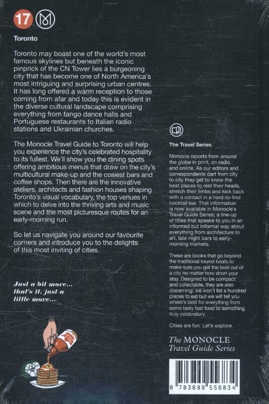 - Q: What type of binding does the book have? A: The Monocle Travel Guide to Toronto is bound in hardcover, ensuring durability and a premium feel.