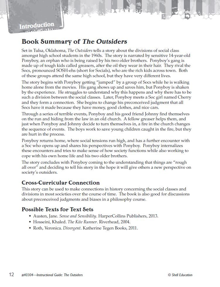 Encourage students to make connections in history while becoming familiar with this wellknown novel by implementing The Outsiders: An Instructional Guide for Literature. These engaging, rigorous lessons and activities work in conjunction with the text to teach students how to analyze and comprehend rich, complex literature. Students will learn how to analyze story elements in multiple ways, practice close reading and textbased vocabulary, determine meaning through textdependent questions, and more.