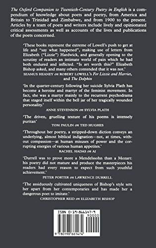 The First And Only Comprehensive Work Of Its Kind, The Companion To Twentieth Century Poetry In English Charts The Development Of Poetry From 1900 To The Present, Across The Whole Of The Englishspeaking World, From The United States, Great Britain, And Ireland To New Zealand, Pakistan, Singapore, Trinidad And Zimbabweanywhere Where Poets Write In English. Alphabetically Arranged For Ease Of Reference, It Offers Biographical Entries On Some 1,500 Individual Poets, As Well As Over One Hundred Entries Covering Important Magazines, Movements, Literary Terms And Concepts.As Readable As It Is Comprehensive, The Companion Offers A Fascinating Survey Of This Century'S Shift From 'Poetry' To 'Poetries,' As American And British Traditions Of Poetry Have Made Way For A Growing Diversity Of Voices, And As The Burgeoning Poetries Of Australia, Canada, And Other Englishspeaking Countries Assert Their Own Identities. The Range Of Poets Represented In This Companion Is Extraordinary. Here Are Indepth Discussions Of Yeats, Eliot, Pound, And Joyce Alongside Provocative Assessments Of W.H. Auden, Elizabeth Bishop, Wallace Stevens, And Marianne Moore. John Ashbery, Margaret Atwood, Maya Angelou, And Mary Oliver Are Accounted For, As Well As Carolyn Forch, David Bottoms, Jorie Graham, And Many Other Younger Poets Just Coming Into Prominence. Chinua Achebee, Jack Mapanje, Femi Oyebode And Other Important African Poets Writing In English Are Here, As Well As Poets From The Caribbean, India, And Even Russia.Readers Will Relish This Companion'S Many Insightful Contributions From Celebrated Poetcritics, Writing On Other Poets In Intriguing Authorsubject Combinations. For Example, Seamus Heaney Writes On Robert Lowell ('Lowell Had Invented A Way Of Getting At Life, Of Making Poetry Kick And Freak At The Edge Of Contemporary Reality'), Ann Stevenson Discusses Sylvia Plath ('In The Quartercentury Following Her Suicide, Sylvia Plath Has Become A Heroine And Martyr Of The Feminist Movement. In Fact, She Was A Martyr Mainly To The Recurrent Psychodrama That Staged Itself Within The Bell Jar Of Her Tragically Wounded Personality'), And Tom Paulin Weighs In On Ted Hughes ('His Appointment As Poet Laureate In 1984 Sealed His Essentially Shamanlike Conception Of His Poetic Mission And Enabled Him To Speak Out On Environmental Issues While Celebrating Royal Weddings And Babies'). Other Pairings Include Jay Parini On Wallace Stevens, Jon Stallworthy On Wilfred Owen And Rupert Brook, And William H. Pritchard On Robert Frost And Randall Jarrell. Each Entry Includes A Wealth Of Biographical And Bibliographical Information, And A Select Bibliography At The End Of The Book Supplies A Handy Source Of Information On Poets Whose Work Is Not Otherwise In Print, Or Readily Available To Readers.From Abse And Auden To Zaturenska And Zukofsky, The Oxford Companion To Twentiethcentury Poetry In English Is An Essential Reference For Students, Lovers Of Poetry, And For Poets Themselves.