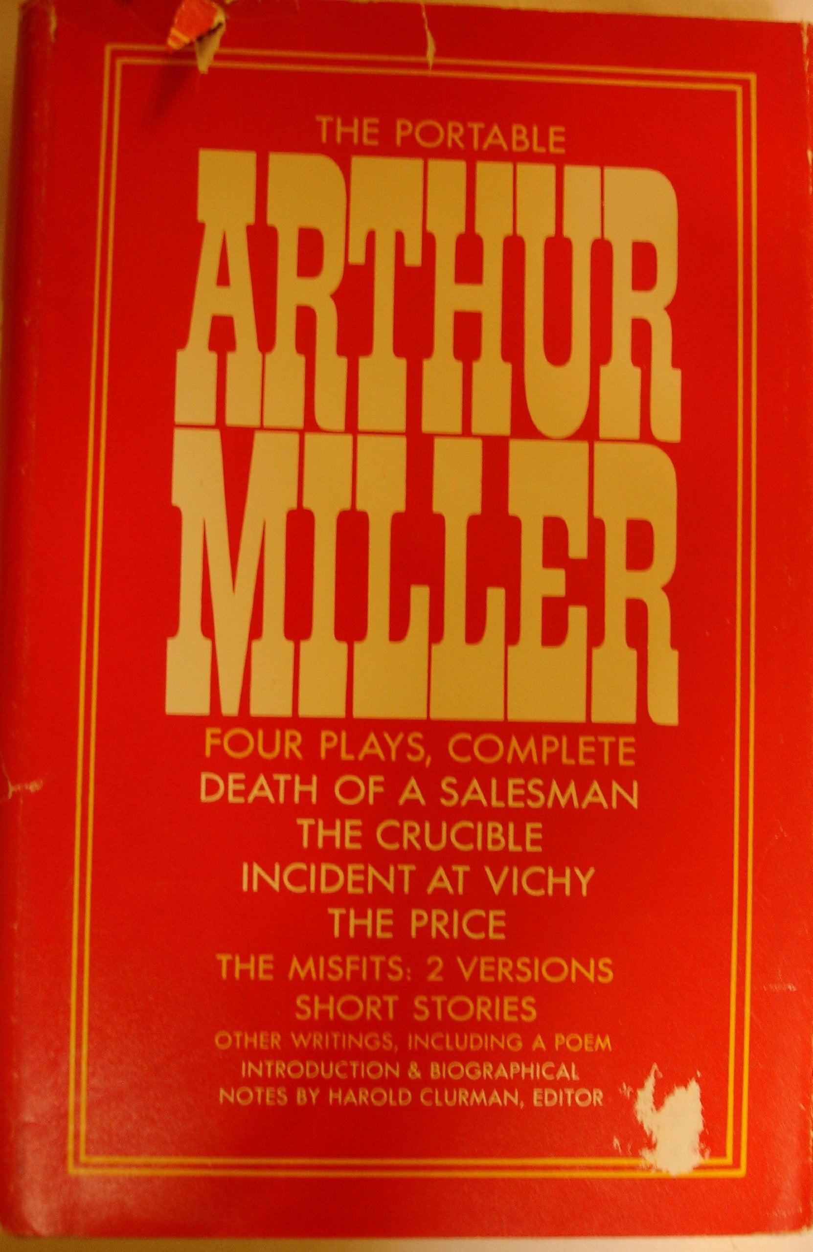 The Portable Arthur Miller is a rich cross section of sixty years of writing from one of this century's most influential and humane playwrights.Contents:Death of a SalesmanThe CrucibleIncident at VichyThe PriceThe Misfits [I] (the original story)From The Misfits [II] (a cinema novel)Fame (a story)Fitter's Night (a story)From In RussiaLines from California (a poem)Bibliography of works by Arthur Miller