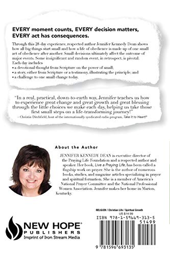 Every moment counts, every decision matters, every act has consequences. Through this 28day experience, respected author Jennifer Kennedy Dean shows how all big things start small and how a life of obedience is made up of one small obedience after another. Small decisions ultimately affect the outcome of major events. Some insignificant and random event, in retrospect, is pivotal. Each day includes a devotional thought from Scripture on the power of small; a story, either from Scripture or a testimony, illustrating the principle; and a challenge to one small change today.
