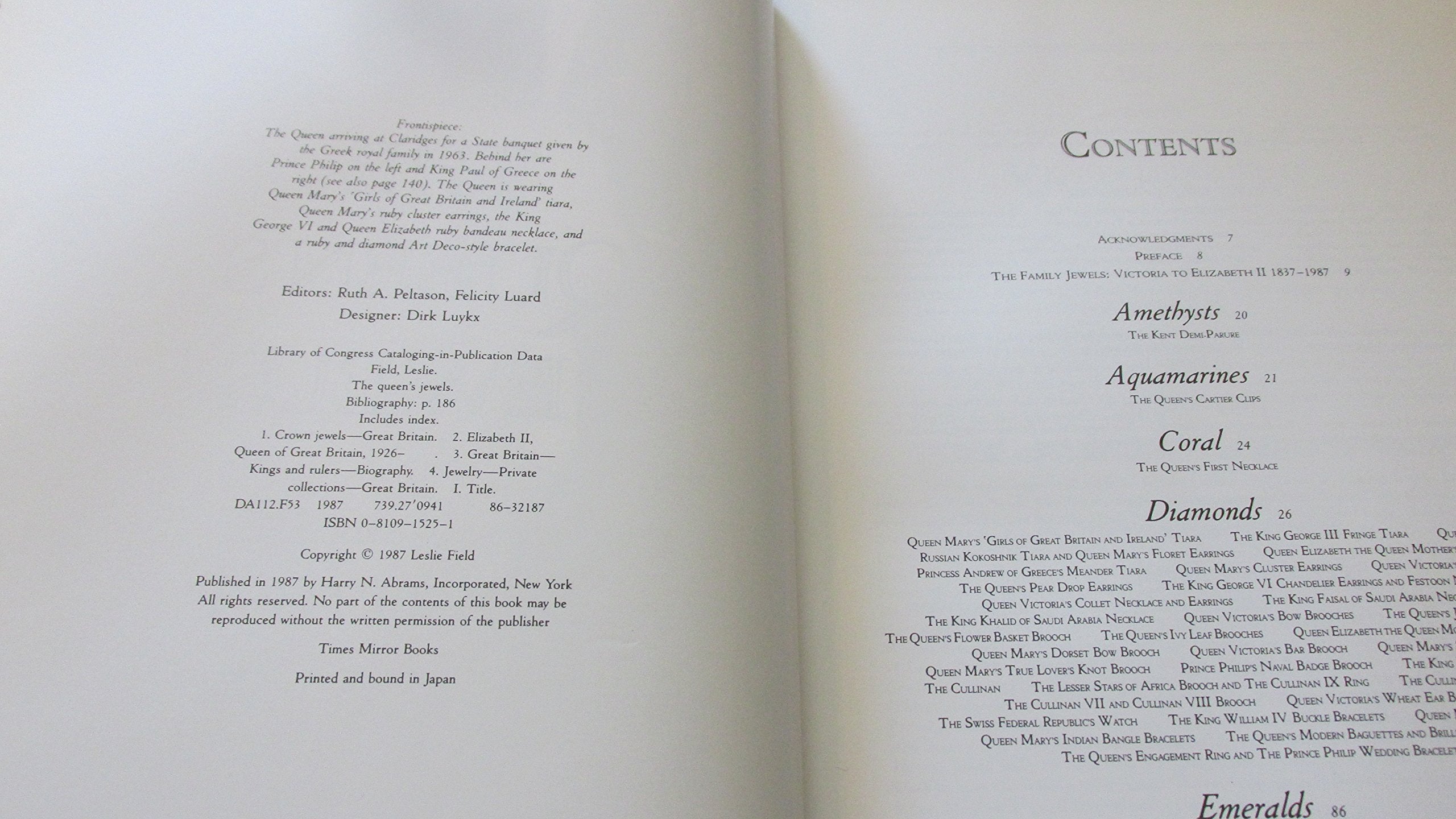 Traces the history and background of crowns, brooches, bracelets, necklaces, earrings, and tiaras owned by the Queen of England