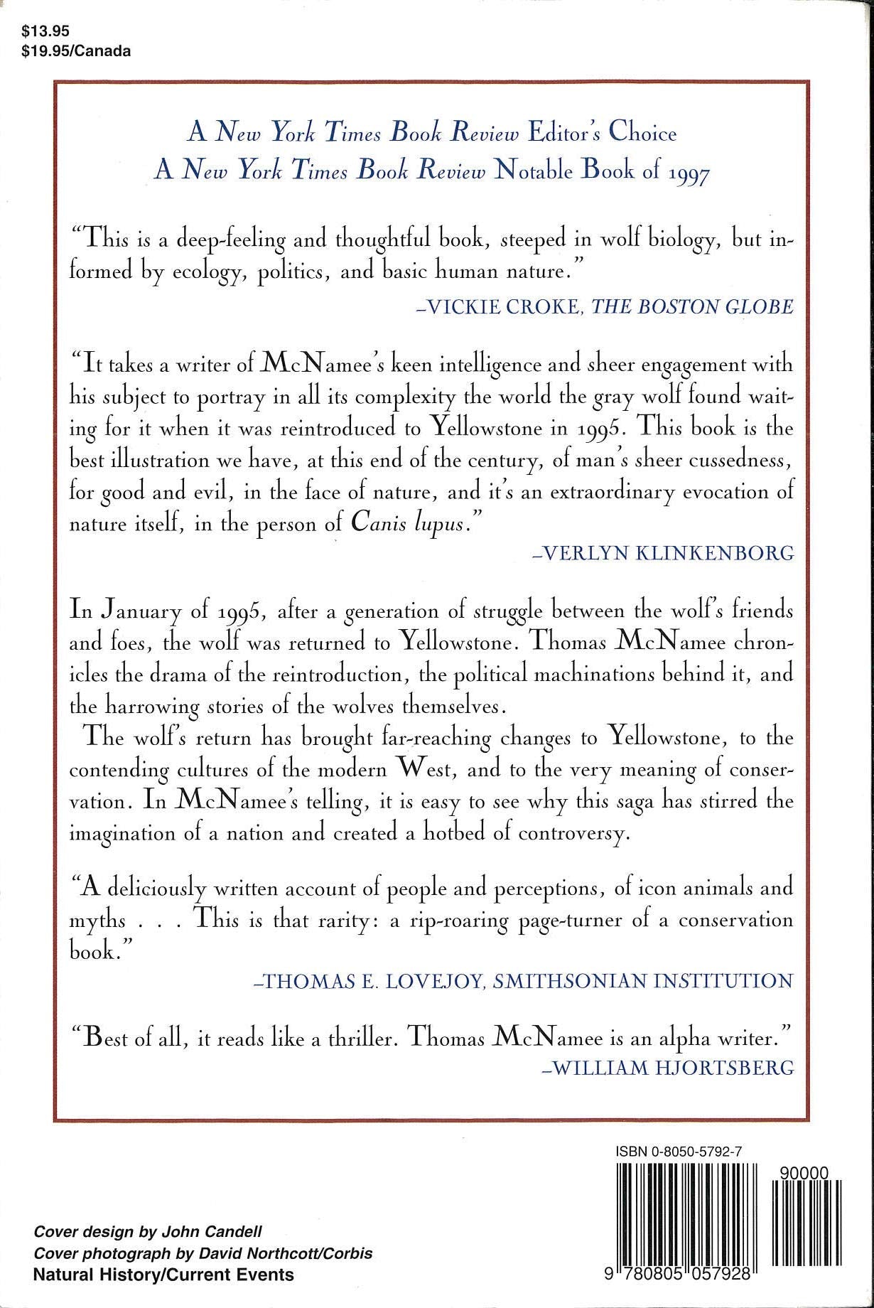 A New York Times Notable BookThe inside account of the environmental story of the decade Early in this century, U.S. government agents trapped, poisoned, or shot every wolf they could track down in and around Yellowstone National Park. By 1926, not one wolf was left alive. After generations of struggle between the wolf's friends and foes, the wolf was returned to Yellowstone in January of 1995. Thomas McNamee chronicles the drama of the reintroduction, the political machinations behind it, and the harrowing details of the wolves' own lives. In his telling, it is easy to see why this saga has stirred the imagination of a nation.