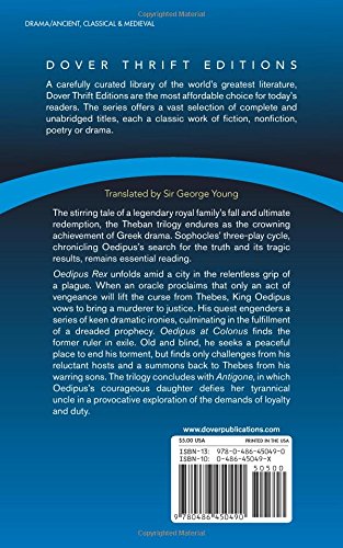 The stirring tale of a legendary royal family's fall and ultimate redemption, the Theban trilogy endures as the crowning achievement of Greek drama. Sophocles' threeplay cycle, chronicling Oedipus's search for the truth and its tragic results, remains essential reading for English and classical studies majors as well as for all students of Western civilization.Oedipus Rex unfolds amid a city in the relentless grip of a plague. When an oracle proclaims that only an act of vengeance will lift the curse from Thebes, King Oedipus vows to bring a murderer to justice. His quest engenders a series of keen dramatic ironies, culminating in the fulfillment of a dreaded prophecy. Oedipus at Colonus finds the former ruler in exile. Old and blind, he seeks a peaceful place to end his torment, but finds only challenges from his reluctant hosts and a summons back to Thebes from his warring sons. The trilogy concludes with Antigone, in which Oedipus's courageous daughter defies her tyrannical uncle in a provocative exploration of the demands of loyalty and duty.