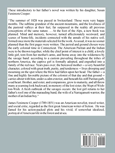 "The summer of 1828 was passed in Switzerland. Those were very happy months. The sublime grandeur of the ancient mountains, and the loveliness of the pastoral valleys at their feet, far surpassed in the reality all previous conceptions of the same nature. ... At the foot of the Alps, a new book was planned. Mind and memory, however, turned affectionately westward; and scenes of homelife, incidents connected with the annals of his native soil, formed once more the materials selected for the work. As usual, it was no sooner planned than the first pages were written. The period and ground chosen were the early colonial time in Connecticut. The American Puritan and the Indian were to be thrown together, while the chief point of interest is a child, a lovely little girl, torn from her mother's arms, and borne away into the wilderness by the savage band: according to a custom prevailing throughout the tribes of northern America, the captive girl is formally adopted, and engrafted into a family of the red race. Years pass over; the bereaved mother a very beautiful character, colored with great truth, purity, and tenderness lives drooping and mourning on the spot where the blow had fallen upon her head. The father a fine and highly favorable picture of the colonist of that day and that ground carries about with him, under a calm exterior, and beneath his stiff Puritan garb, a sad heart. Brother, and sister, and companions, grow to maturity, and all throw many a yearning look backward, in memory of the lost sister, the Wept of WishtonWish. A fresh outbreak of the savages occurs: the lost girl returns to her father's roof one of the marauding band, the wife of a Narragansett warrior, the mother of an Indian boy."
