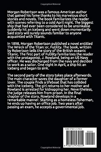 Morgan Robertson was a famous American author that gained his fame thanks to his marvelous short stories and novels. The book familiarizes the reader with scenes referring to a cold April night. The biggest ship that had ever been considered to be unsinkable suddenly hit an iceberg and went down momentarily. Said story will surely sounds familiar to anyone acquainted with Titanic.In 1898, Morgan Robertson published a novel entitled The Wreck of the Titan: or, Futility. The book, written by Robertson tells the story of the British oceanic Titanic. The first part of Futility familiarizes the reader with the protagonist, J. Rowland, being an US Navy officer. He was discharged from the navy and decided to work as a sailor. One night in April, a ship hit an iceberg and began to sink.The second party of the story takes place afterwards. The main character saves the daughter of a former lover. The couple finds a lifeboat that has collided with the iceberg. The girl returns to her mother and Rowland is arrested for kidnapping her. Nevertheless, the judge releases him from prison. In the final chapter of the story, Rowland develops in a remarkable manner. Starting as a homeless fisherman, he ends up having an office job. Two years after passing an exam, he accepts a governmental job.