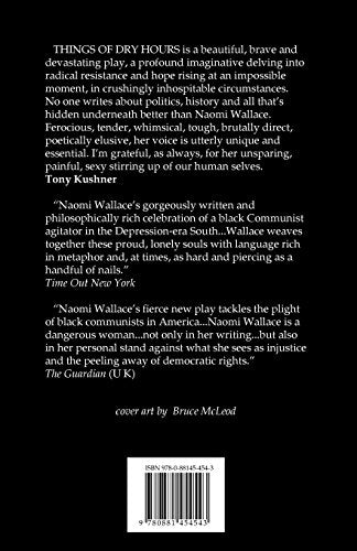 In Depressionera Alabama, black Sunday school teacher and Communist Party member Tice Hogan lives on the edge of trouble. When a white factory worker on the run demands sanctuary, Tice and his daughter may be pushed over that edge.THINGS OF DRY HOURS is a beautiful, brave and devastating play, a profound imaginative delving into radical resistance and hope rising at an impossible moment, in crushingly inhospitable circumstances. No one writes about politics, history and all thats hidden underneath better than Naomi Wallace. Ferocious, tender, whimsical, tough, brutally direct, poetically elusive, her voice is utterly unique and essential. Im grateful, as always, for her unsparing, painful, sexy stirring up of our human selves. Tony KushnerNaomi Wallaces gorgeously written and philosophically rich celebration of a black Communist agitator in the Depressionera South Wallace weaves together these proud, lonely souls with language rich in metaphor and, at times, as hard and piercing as a handful of nails. Time Out New YorkNaomi Wallaces fierce new play tackles the plight of black communists in America Naomi Wallace is a dangerous woman not only in her writing but also in her personal stand against what she sees as injustice and the peeling away of democratic rights. The Guardian (U K)