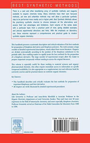 There is a vast and often bewildering array of synthetic methods and reagents available to organic chemists today. The Best Synthetic Methods series allows any scientist who is interested in the chemical transformations of molecules to choose between all the alternatives and assess their real advantages and limitations. With the emphasis on laboratory use, these volumes represent a comprehensive and practical guide to modern synthetic organic chemistry.This book is the product of the authors many years practical experience and reading of the original literature. It contains a valuable distillation and critical evaluation of the Best Synthetic Methods for the formation and reaction of thiophenes (five membered heterocycles containing a ring sulfur) or polymers containing a thiophene functionality (thienyls). A brief review of each area is provided, but the emphasis in all cases is on describing efficient practical methods to effect the transformations described. The reader can therefore use this book to rapidly review and select the best methods of performing a synthetic conversion to create or modify a specifically substituted thiophene.Although this book contains many references to the original literature, the large number of experimental recipes enables the user to prepare a thiophene derivative without access to the original literature. These features make the handbook especially useful for physicists working in material sciences and organic/pharmaceutical chemists, who rapidly want to find out the availability of (or how to make) a specific thiophene. Contains a systematic description and critical evaluation of the best methods for preparation of thiophenes and polymers containing thiophenes Rapid location of methods achieved by systematic division of substituents following the periodic table All chapters are richly illustrated by detailed experimental proceedures for the synthesis of five membered heterocycles containing sulfur