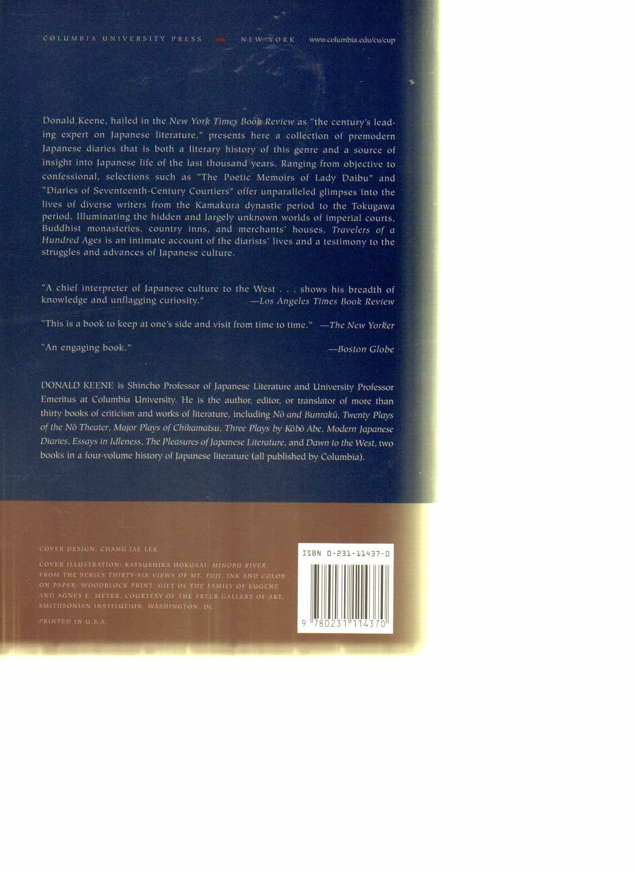 Donald Keene, Hailed In The New York Times Book Review As 'The Century'S Leading Expert On Japanese Literature,' Presents Here A Collection Of Premodern Japanese Diaries That Is Both A Literary History Of This Genre And A Source Of Insight Into Japanese Life Of The Last Thousand Years. Ranging From Objective To Confessional, Selections Such As 'The Poetic Memoirs Of Lady Daibu' And 'Diaries Of Seventeenthcentury Courtiers' Offer Unparalleled Glimpses Into The Lives Of Diverse Writers From The Kamakura Dynastic Period To The Tokugawa Period. Illuminating The Hidden And Largely Unknown Worlds Of Imperial Courts, Buddhist Monasteries, Country Inns, And Merchants' Houses, Travelers Of A Hundred Ages Is An Intimate Account Of The Diarists' Lives And A Testimony To The Struggles And Advances Of Japanese Culture.