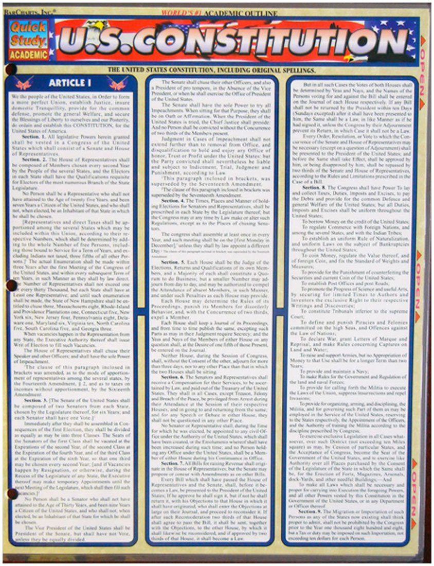 Our popular U.S. Constitution guide just got even better for 2010! This new and improved 3panel version features a completely redesigned format, enabling each component from articles to amendments to stand out more clearly for reference purposes. Thanks to BarCharts, history buffs have another reason to celebrate!"