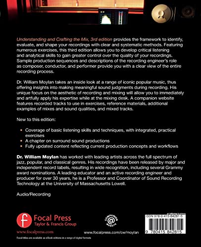 Understanding and Crafting the Mix, 3rd edition provides the framework to identify, evaluate, and shape your recordings with clear and systematic methods. Featuring numerous exercises, this third edition allows you to develop critical listening and analytical skills to gain greater control over the quality of your recordings. Sample production sequences and descriptions of the recording engineers role as composer, conductor, and performer provide you with a clear view of the entire recording process.Dr. William Moylan takes an inside look into a range of iconic popular music, thus offering insights into making meaningful sound judgments during recording. His unique focus on the aesthetic of recording and mixing will allow you to immediately and artfully apply his expertise while at the mixing desk. A companion website features recorded tracks to use in exercises, reference materials, additional examples of mixes and sound qualities, and mixed tracks.