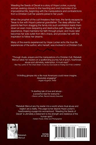 Weeding the Seeds of Deceit is a story of Hope Locker, a young woman seeking closure to the haunting and vivid memories of an impoverished life, beginning with the manipulations and contradictions from a Christian Cult her parents joined in her youth. When the prophet of the cult threatens their lives, the family escapes to Texas to live with Hope's paternal grandfather. The deep affliction her parents feel from dragging the family into such annihilation leads them down an even more despairing and destructive path. Despite the cult experience, Hope maintains her faith through prayer, and music later becomes her sole outlet from life's chaos, and provides her with the inspiration to follow her dreams. Many of the events experienced by Hope Locker echo the truelife experiences of the author, who herself, was involved in a Christian Cult.