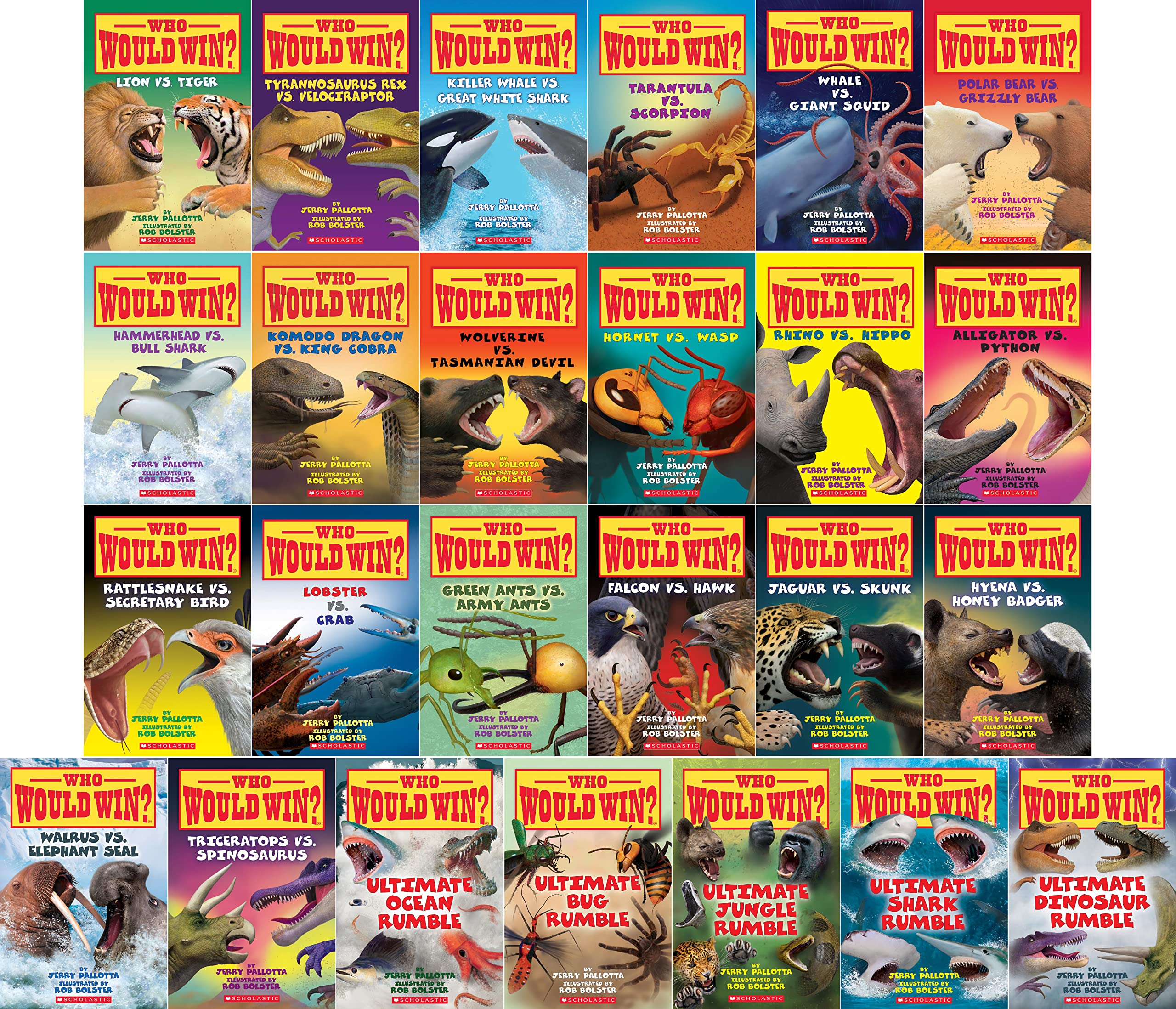 Which wild animals would win a deadly fight? Find out in this awesome set of 25 books from the wildly popular Who Would Win Books Series! This set features a variety of over 100 new birds, dinosaurs, insects, and mammals! Students and young readers explore the facts and characteristics between two wild animals. Facts and Photos provide a contrast between two different creatures; comparing their brain structures, bodies, behaviors, and abilities. Now Featuring 20 Wild Matchups! 1. Alligator vs. Python 2. Hammerhead vs. Bull Shark 3. Hornet vs. Wasp 4. Hyena vs. Honey Badger 5. Jaguar vs. Skunk 6. Komodo Dragon vs. King Cobra 7. Lion vs. Tiger 8. Lobster vs. Crab 9. Polar Bear vs. Grizzly Bear 10. Rattlesnake vs. Secretary Bird 11. Rhino vs. Hippo 12. Tarantula vs. Scorpion 13. TRex vs. Velociraptor 14. Triceratops vs. Spinosaurus 15. Walrus vs. Elephant Seal 16. Killer Whale vs. Great White Shark 17. Whale vs. Squid 18. Wolverine vs. Tasmanian Devil 19. Green Ants vs. Army Ants 20. Falcon vs. Hawk And 5 Rumble Fights: 1. Ultimate Bug Rumble 2. Ultimate Shark Rumble 3. Ultimate Jungle Rumble 4. Ultimate Ocean Rumble 5. Ultimate Dinosaur Rumble