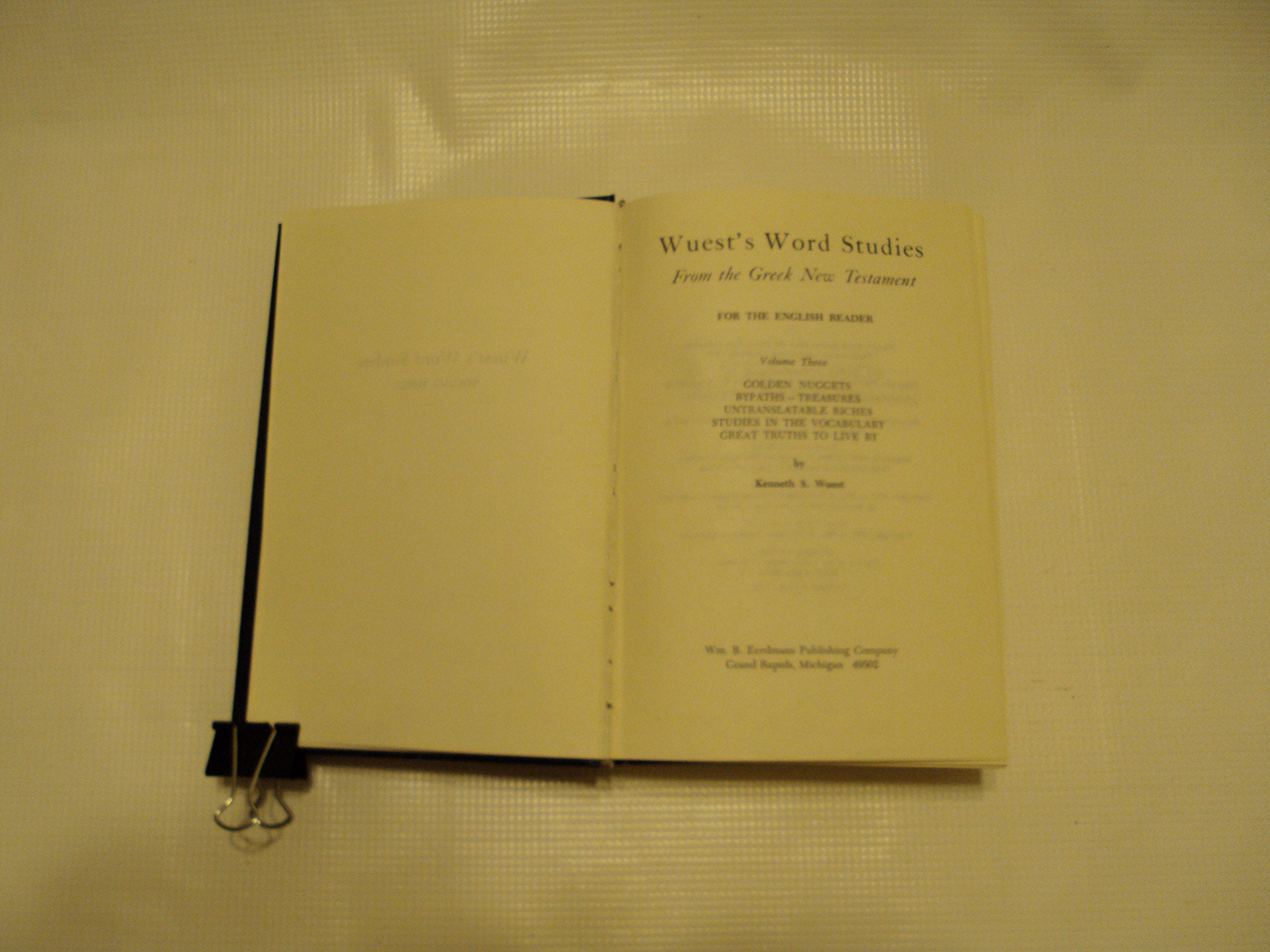 A wealth of information on most of the Greek New Testamentall in nontechnical language! This reader's companion series clarifies many of the English words that do not fully capture the meaning of original Greek words. Includes topical word and devotional studies, book studies on most of Paul's epistles, and Wuest's New TestamentAn Expanded Translation. Wuest used interpretative material based on the Greek text, some original with the author and some selected from other Greek authorities such as Marvin Vincent and Henry Barclay Swete. The order of the Greek words has been preserved as much as possible so the reader may see where the Greek places the emphasis. Polished diction has been sacrificed in the in interest of clarity and a closer adherence to the style and force of the Greek text.