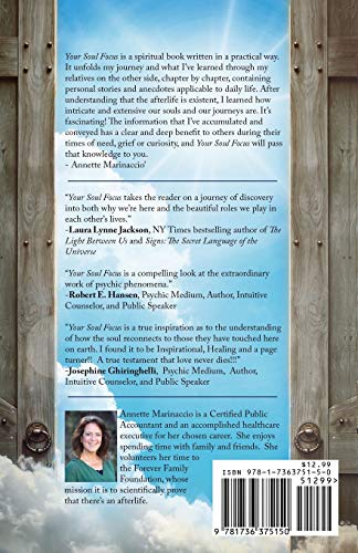 Do you wonder if there is more to this life? Do you wonder why we are here? Do you wonder why our loved ones die? Do you want to connect with your souls purpose? Your Soul Focus is a spiritual book written in a practical way. It helps to answer these questions and more . AFTER my motherinlaw died, she showed me that she is still here. After understanding that the afterlife is existent, I learned how intricate and extensive our souls and our journeys are. Its fascinating! The information that Ive accumulated and conveyed has a clear and deep benefit to others during their times of need, grief or curiosity, and Your Soul Focus will pass that knowledge to you. Annette Marinaccio, CPA